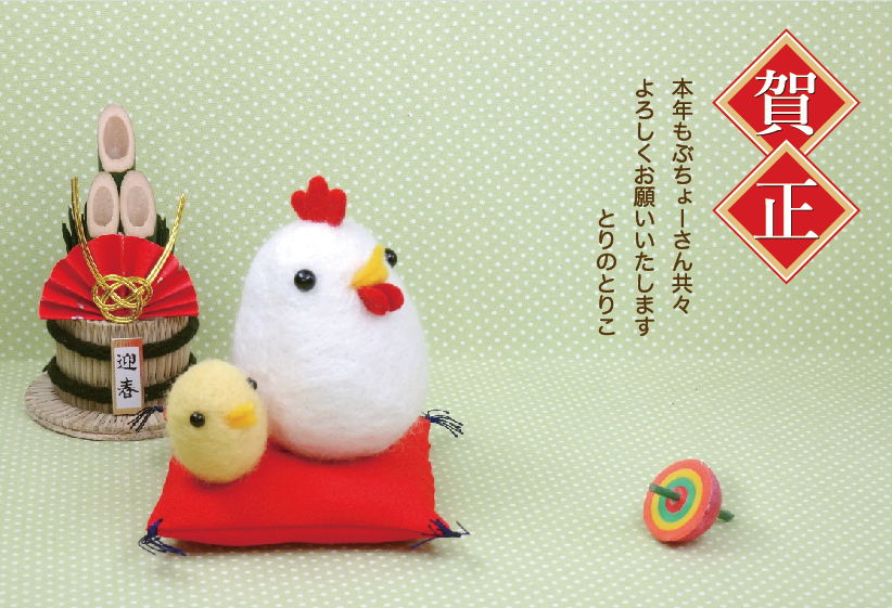 今年の年賀状ですが、教室用に作ったにわとりにしようと決めていて、すでに去年の夏に年賀状撮影は終わってたんですが、まわりから「酉年の年賀状期待してるよ」と言われ「うっ…」となり(去年の猿は作る暇がなくてイラスト書いたら皆から手抜きと言われた)急きょ年賀状をぶちょーさんバージョンに作り直しました。