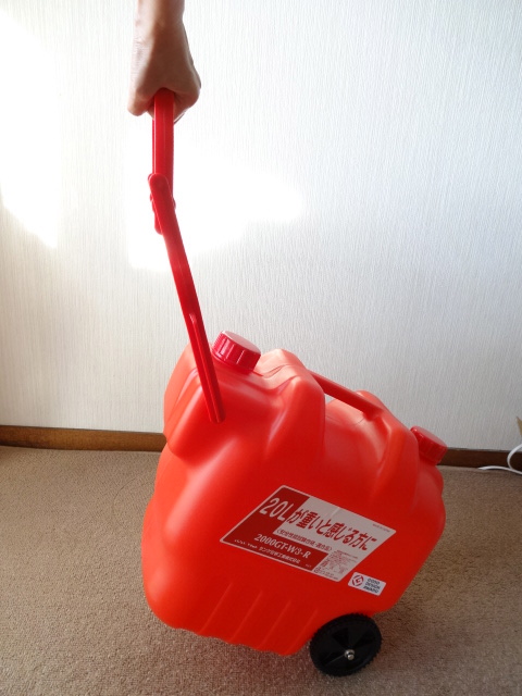 で、ゴールド免許を持っているものの1秒も車を運転した事のない私は(だからゴールドなの)、今までガラガラカートに灯油缶をくくりつけて徒歩か、自転車の前カゴに灯油缶を斜めに入れてガソリンスタンドまで買いに行ってましたが、ガラガラカートは灯油が重すぎて途中で落ちるし、自転車の前カゴは重量的に12Lが限界なので、月に2回は買いに行かなくてはならず、これが結構面倒。
