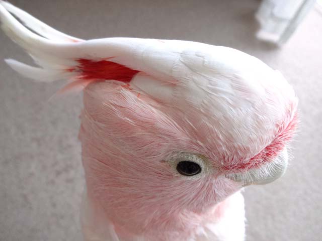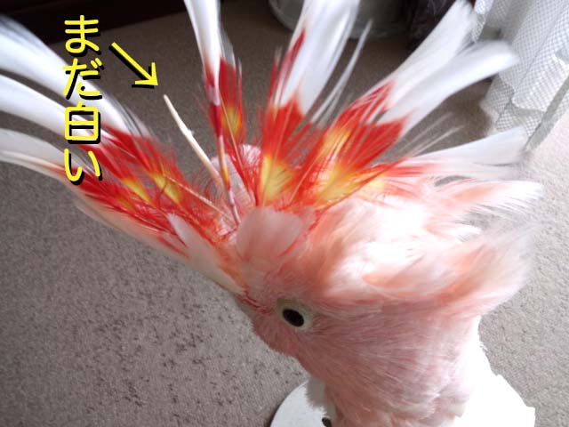 これが新しく生えてきたばかりの冠羽。まだ白い毛しかなくて、根元には血が詰まっていて、おそらくこの状態で冠羽が折れたら噴水のごとく出血する事が予想される(おそろしや〜)