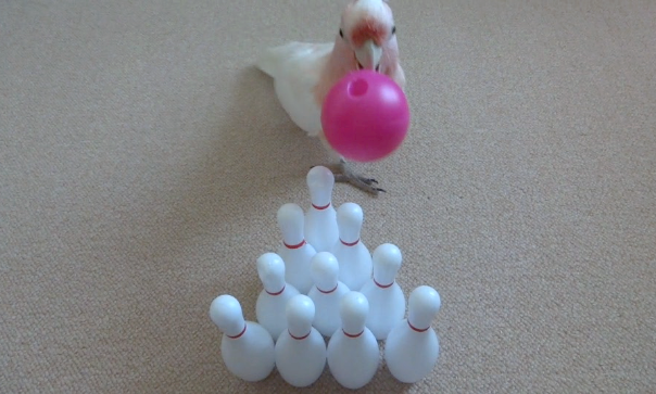 【13日目】ついに10本にチャレンジするものの、くちばし先でコロコロ転がすと、思うようにまっすぐ転がない事にイラつきを覚え、指を入れる穴を直接くわえてぶん投げる方法に勝手に変更される(まぁ良しとしましょう)
