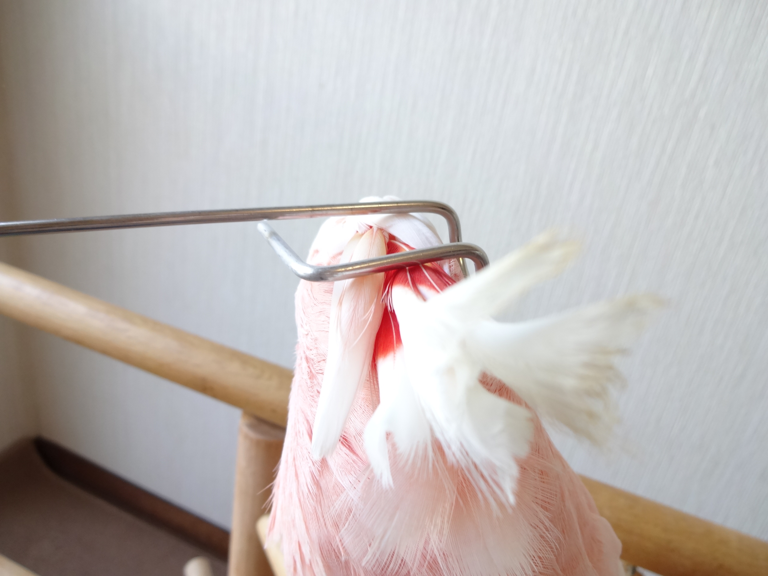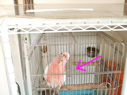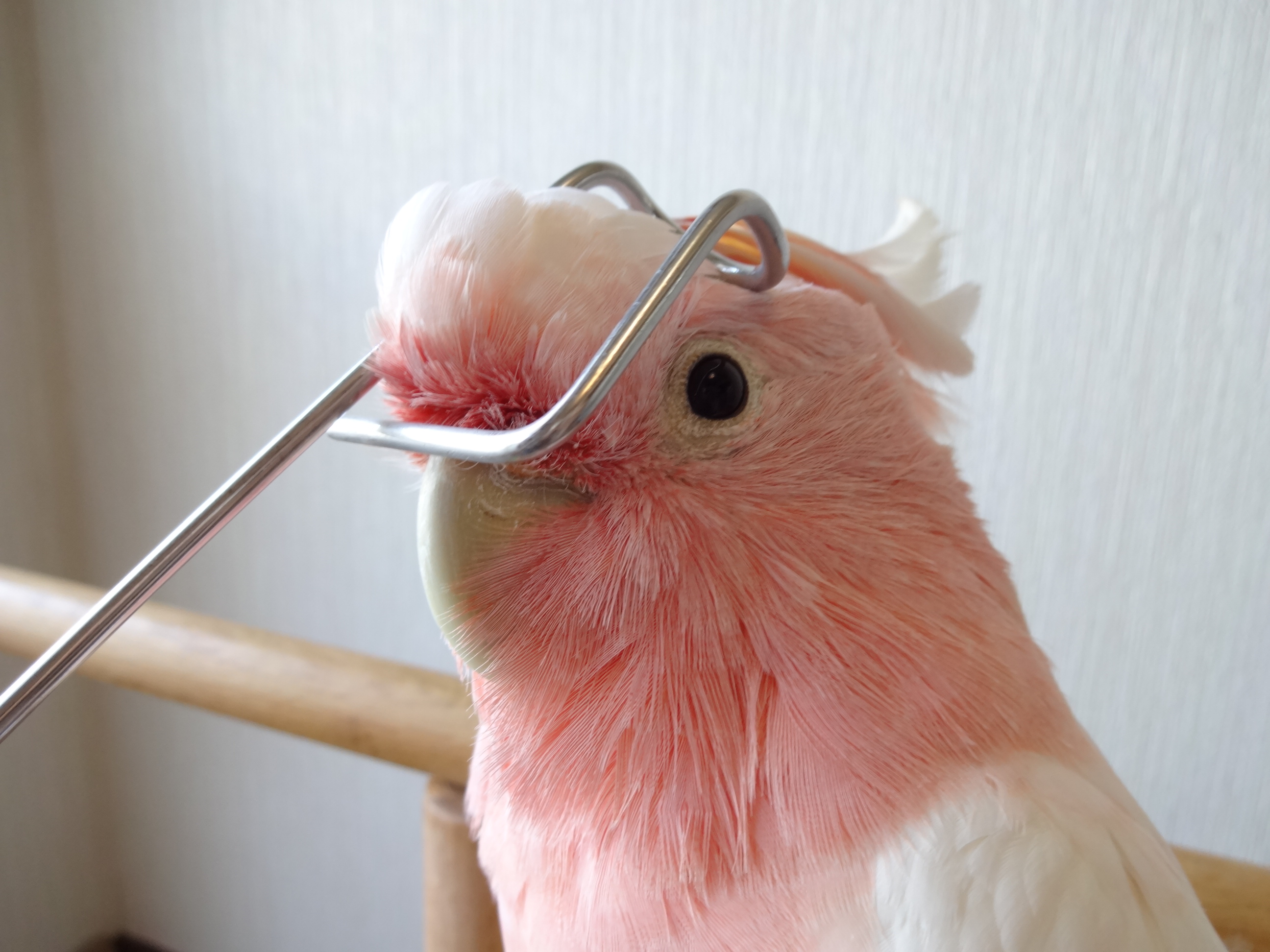 で、外にいる時のぶちょーさんなりのナデられ方流儀というのがあって、大型鳥を飼った事のある人なら見た事があるかもしれませんが、HOEIケージの入り口に鍵?というか、長い棒がついていまして、なぜかこれを使うとナデナデさせてくれます。