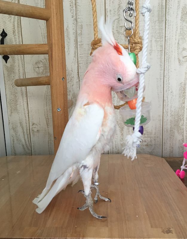 ぶちょーさんへのプレゼントで頂いた鳥用フォージングトイですが、難易度を上げるために高いところへ設置したらこんな状態になりました。
