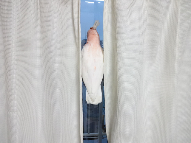 電気をつけた状態でカーテン全開にすると部屋の中が丸見えになるので、暗い時間帯に窓の外を見せる時はこんな状態になります。外からこの部屋を見た人は一体何を見たと思うだろうか...。