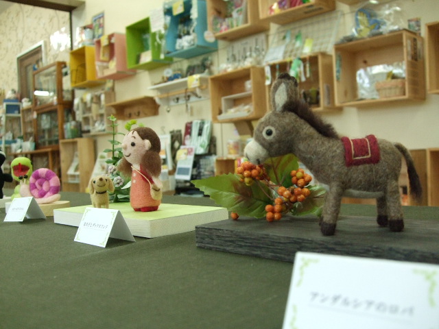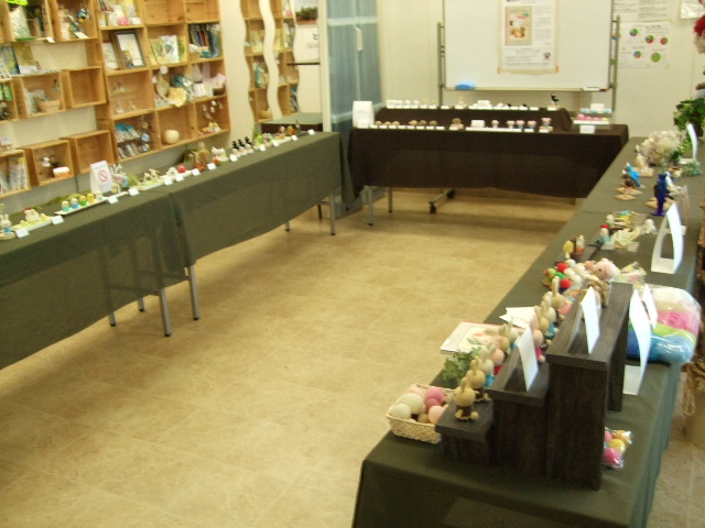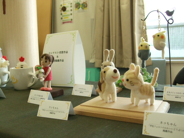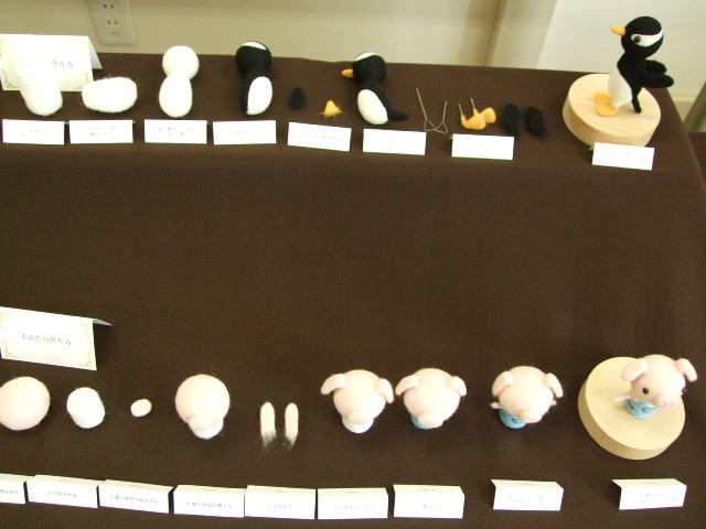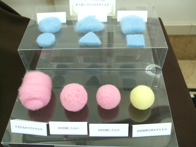 一番奥は作品の作り方を行程順に並べたり、300回、600回刺すとどのくらい固くなるのかを実際に触っていただける「羊毛フェルトのお勉強スペース」にしました。