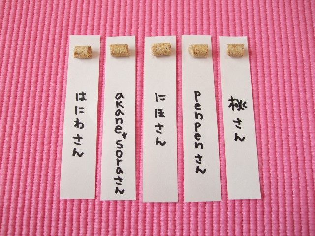 各紙の上にはペレットが置いてあります。ペレットを最初に食べた場所に名前が書いてある人が1位になります(参加資格対象外の方はお名前を外させていただきました。ごめんなさい)。
