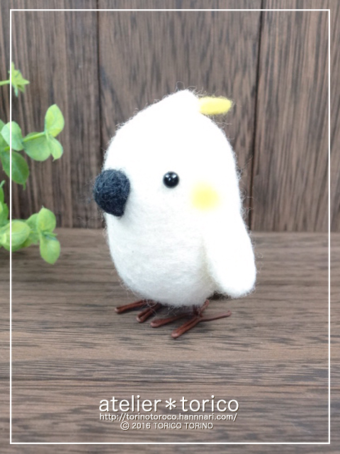 こちらは先に紹介した作品と形は似ていますが、足はカラーワイヤーを使用しています。本日紹介する白色オウム3点は全て翼の裏と尾羽の裏に薄い黄色を刺してあり、ピンクのお尻もついています。マスコットと言えども見えない所までこだわって作った作品です^^