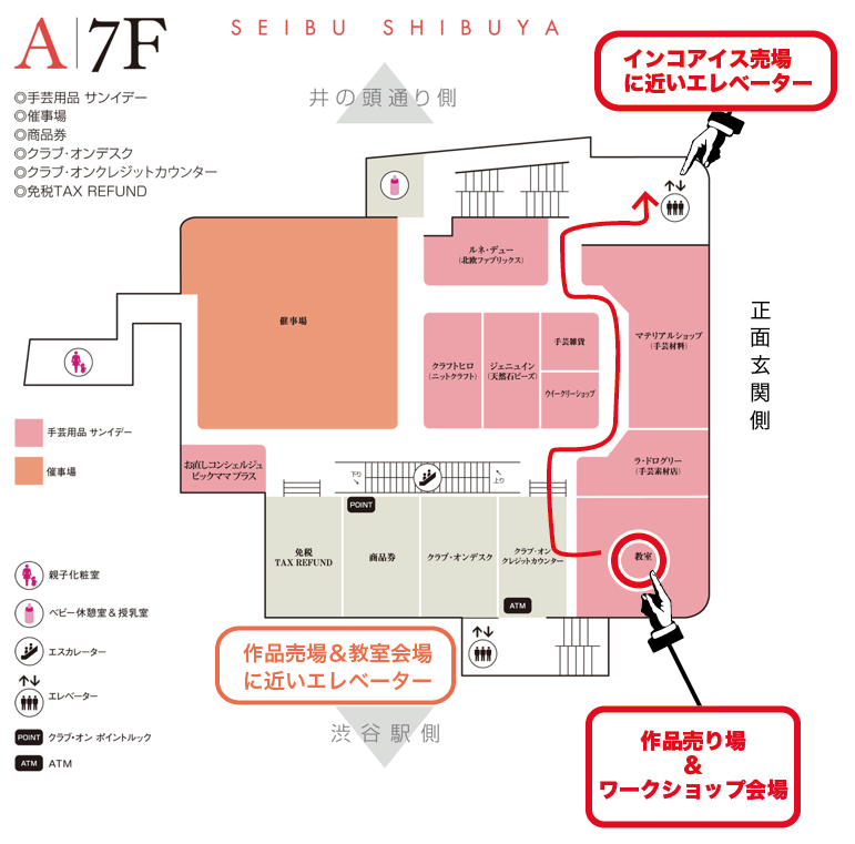 7Fの作品売場ではなく、外から入る場合は、駅側のエレベーターではなく、正面の大きな入り口から入って右に進むと奥にエレベーターがあります。
