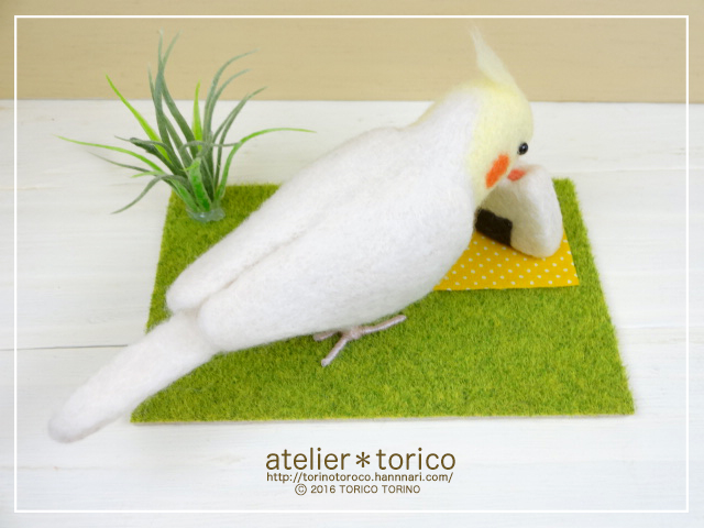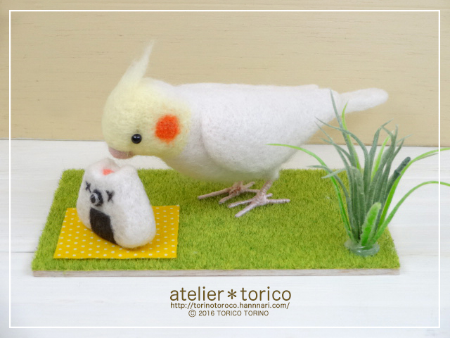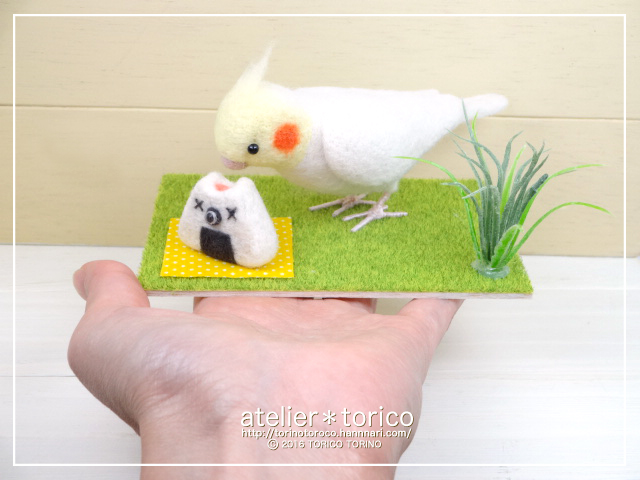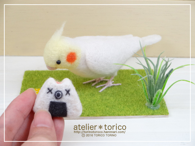 「羊毛フェルトの鳥さんたち」P.47でオカメインコがとりむすびを食べてるシーンを再現