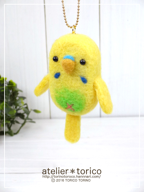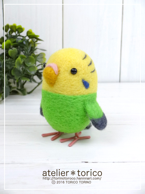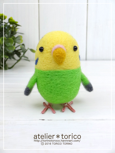 こちらは上のインコと似ていますが、教室用に作った仕様のもので、上のものよりも模様がシンプルになっています。その分ブルーのインコより少し値段が安くなっています。前回のグリーンよりも濃いきみどり色の羊毛で作りました。