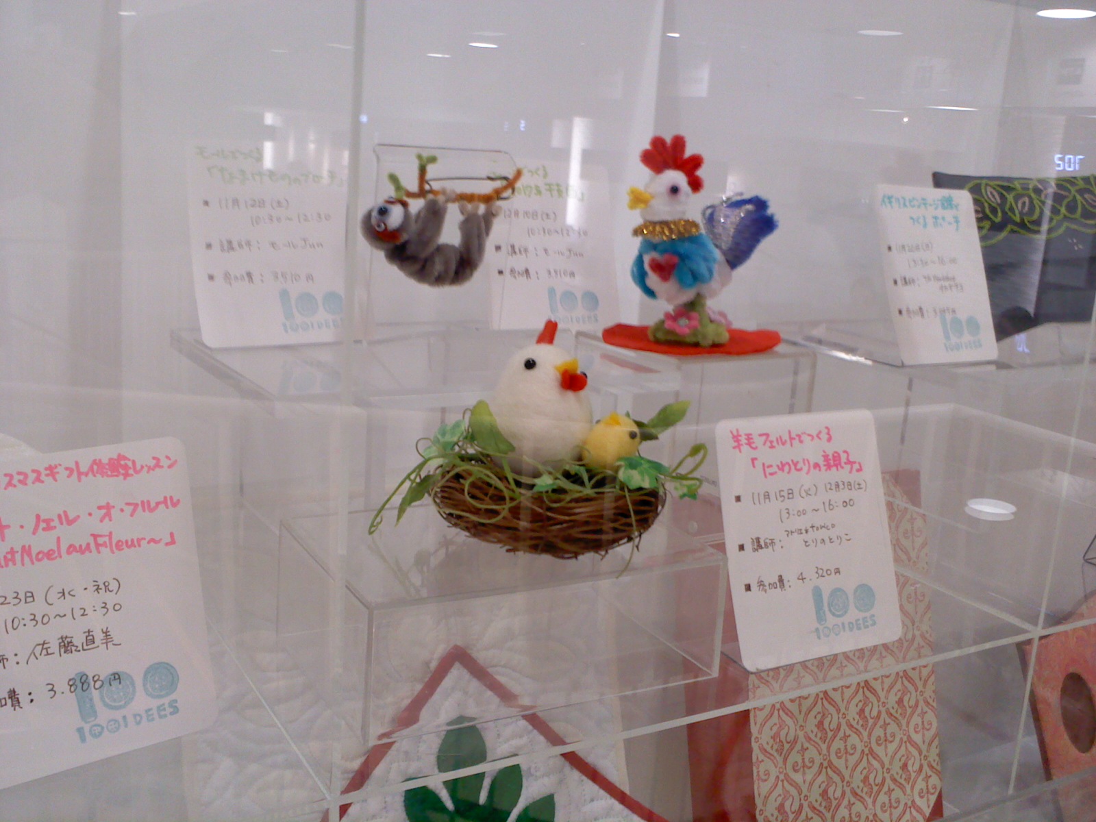 ちなみに「にわとりの親子ワークショップ」は火曜クラスも土曜クラスもまだ空きがあるそうです。作品の販売場所からレジへ行く途中の階段横にワークショップ見本作品が飾ってあるので、お店へ来た方は是非こちらのにわとり親子も見てやってくださいね♪