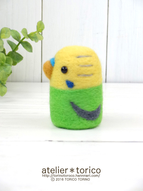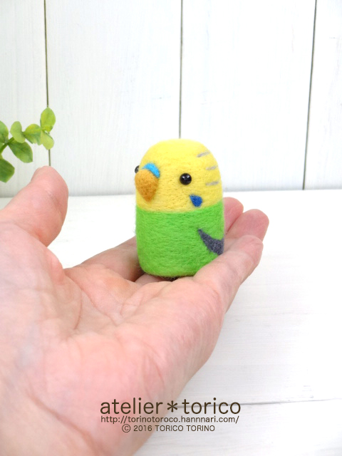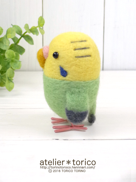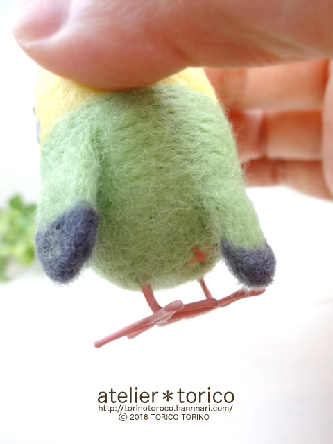先に紹介した書籍掲載のセキセイインコ/ブルーと似ていますが、お尻や翼の形が違っていて足は固めのカラーワイヤーを使用しています。ボディは鮮やかな緑ではなく、やさしい黄緑色の羊毛で作りました。ピンク色のお尻の穴付♪