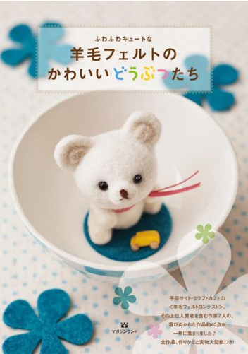「羊毛フェルトのかわいいどうぶつたち(マガジンランド刊)」P.10のグラビアページに掲載された現品です。本に作り方が載っているので、現物を見ながら羊毛フェルトの勉強をしたい人にもオススメです♪