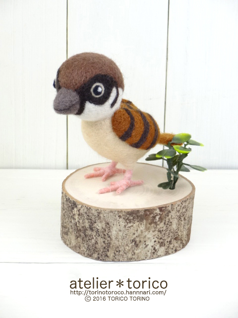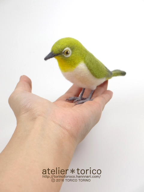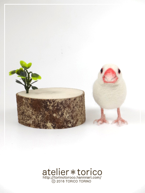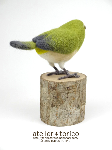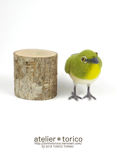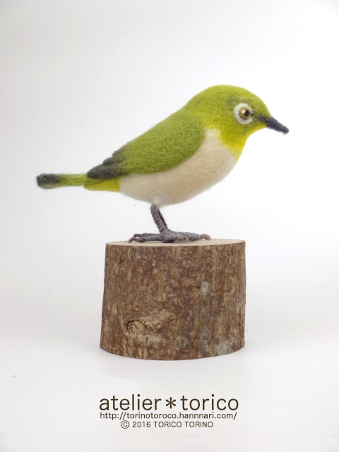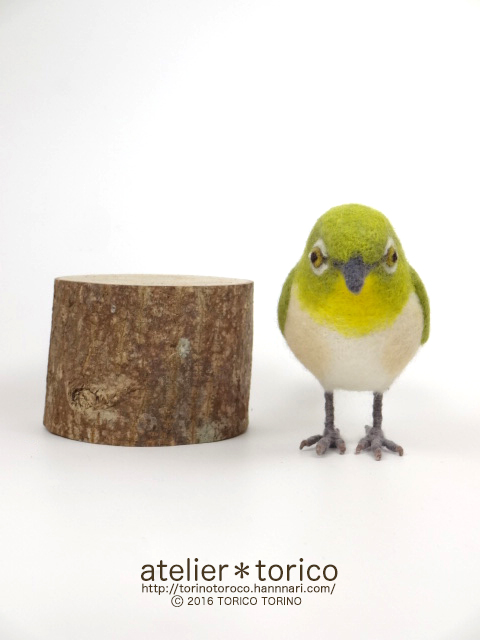 元々教室用に作ったものなので、生徒さんが作りやすいように実際のメジロよりも大きいサイズで制作してあります。切り株の飾り台付き。