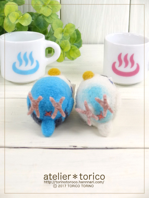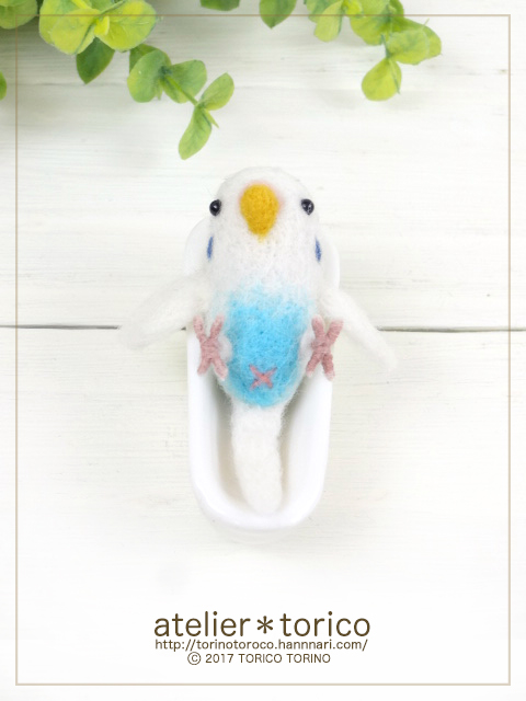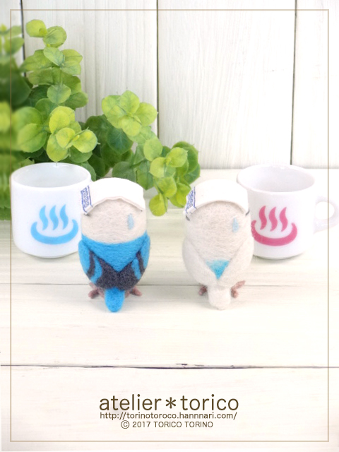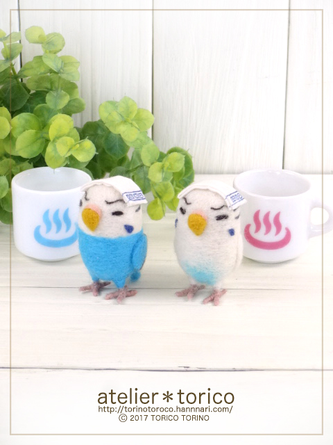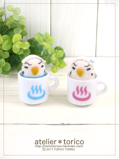 いつもマグ温泉に入れる鳥はのぼせているような顔の鳥で作っていましたが、今回は特別にセキセイインコで作ってみました。