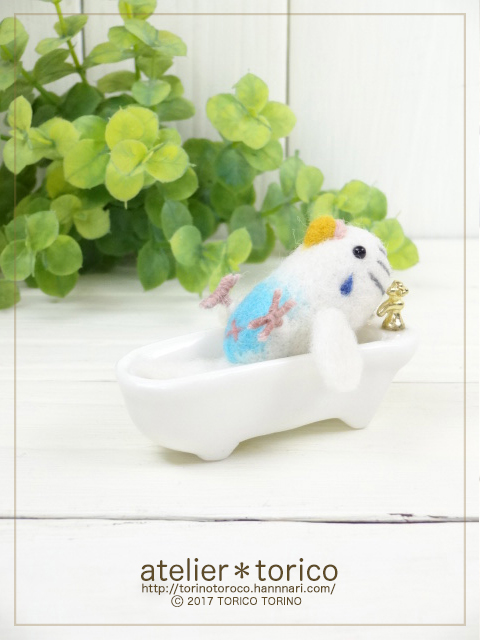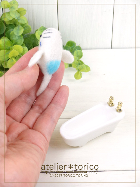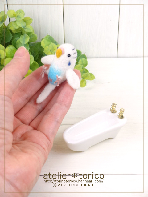 ずっと前にもバスタブに入ったインコを作った事があるけど、今回のバスタブはさらに小さく、長さもあるので、インコの形も細長く進化させました。