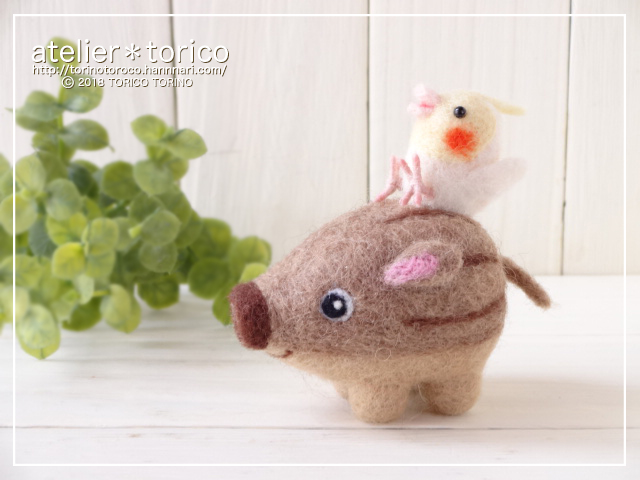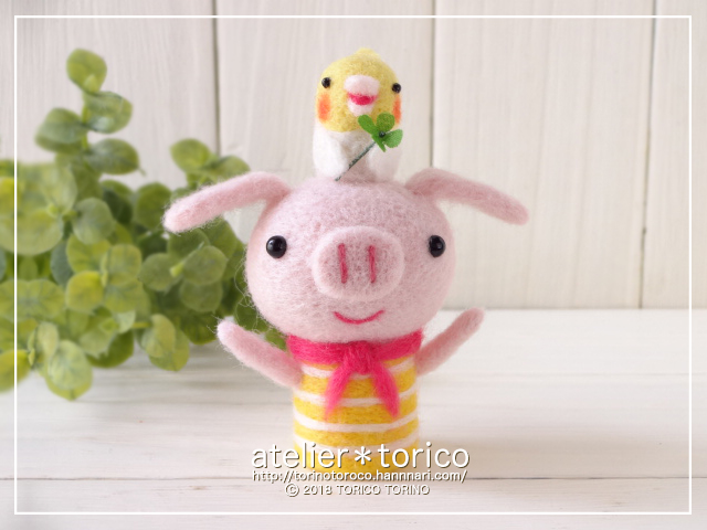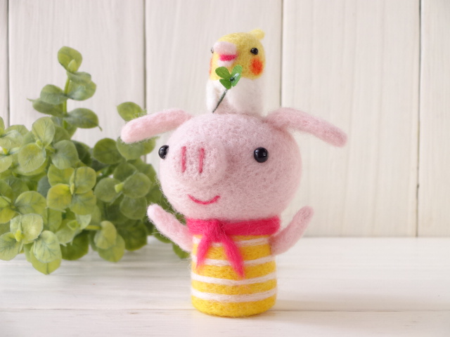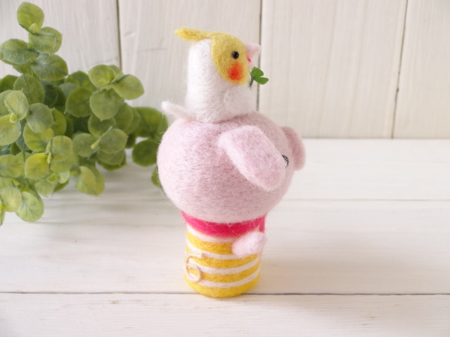昨日に引き続き「羊毛フェルトマスコット魔法のテクニックBOOk」より子ブタちゃんとオカメインコのコラボ作品です。
