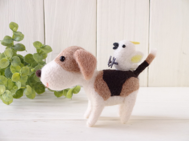 書籍掲載作品と鳥とのコラボ作品の最後は「ふわふわキュートな羊毛フェルトのかわいいどうぶつたち」よりワンコとキバタンです。