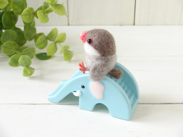 シナモン文鳥をすべり台に座らせました。