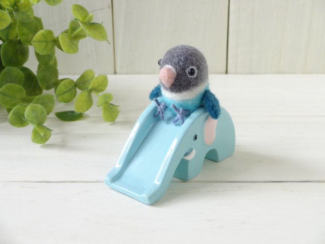 前回の文鳥に続きボタンインコもすべり台に座らせました。