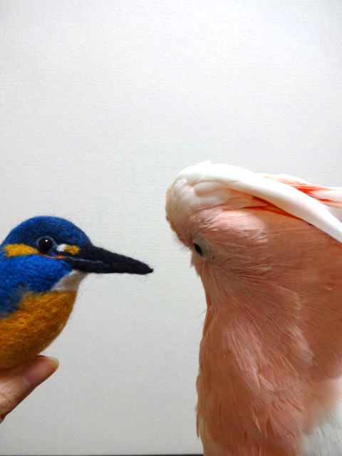 鳥が嫌いなぶちょーさんにリアル鳥を見せると必ずといっていいほど襲われますが、制作途中のカワセミはリアル鳥認定されなかったようで、まったく興味を示しませんでした。