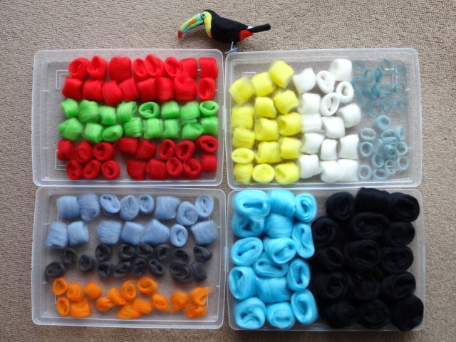 表面的なカラーは12色だけど、混色したオリジナルカラーも混ざっているので実際は20色くらいの羊毛を使用しています。 黒い鳥だけどこうしてみると実はカラフルな鳥っていうのがよくわかりますね(見本作品を置かなければ何の鳥のキットなのかよくわからない)