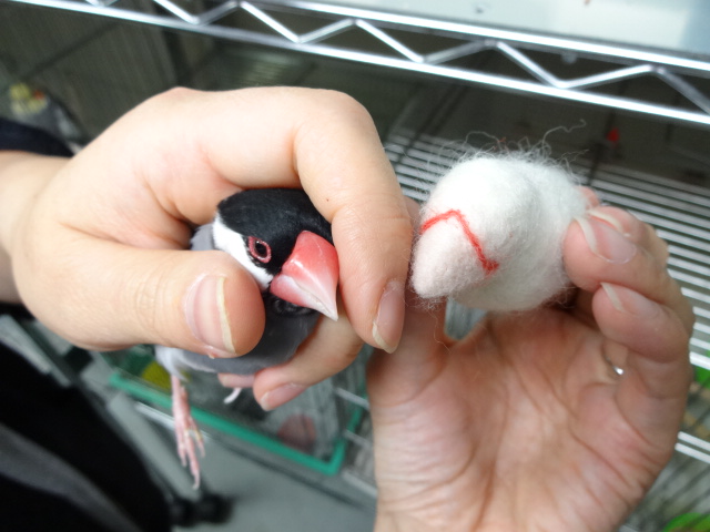 再々リベンジで土台を作り、またまた人慣れした文鳥の文ちゃんにご協力をいただきサイズ比較をしてきました(※文鳥を握っているのは慣れたスタッフさんで、強制ではなく遊びながら握ってますのでご安心ください)