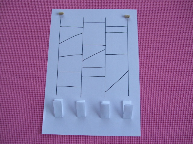 前回の抽選会を練習した時は執行人がほぼストレートにしか進まず、隅に置かれた人が不利だったので、今回は全員平等になるようにペレットは両サイドに置き、名前を書いた紙も畳んだ後にグルグルとかき混ぜて誰がどこに配置されたかわからないようにしてあります。