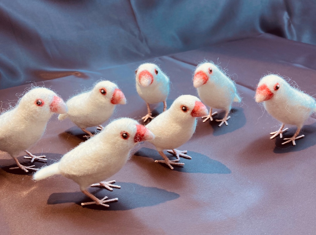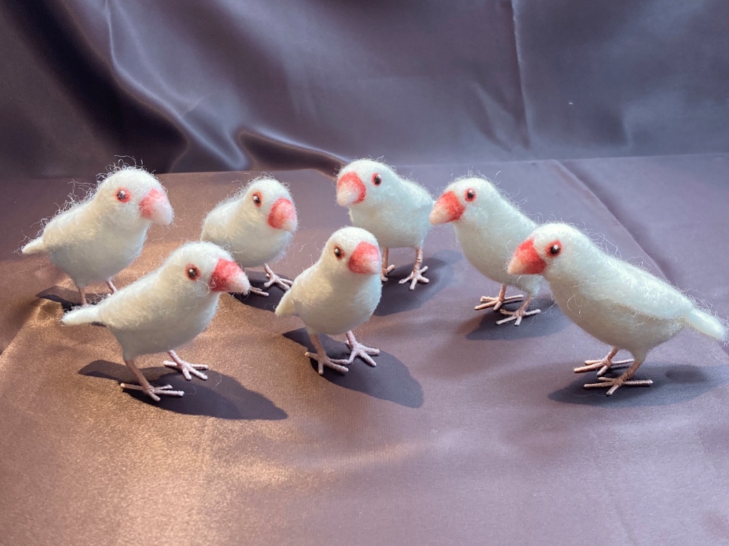羊毛フェルトで作るプチリアル鳥講座、平日クラスと日曜クラスの白文鳥が完成しました。
