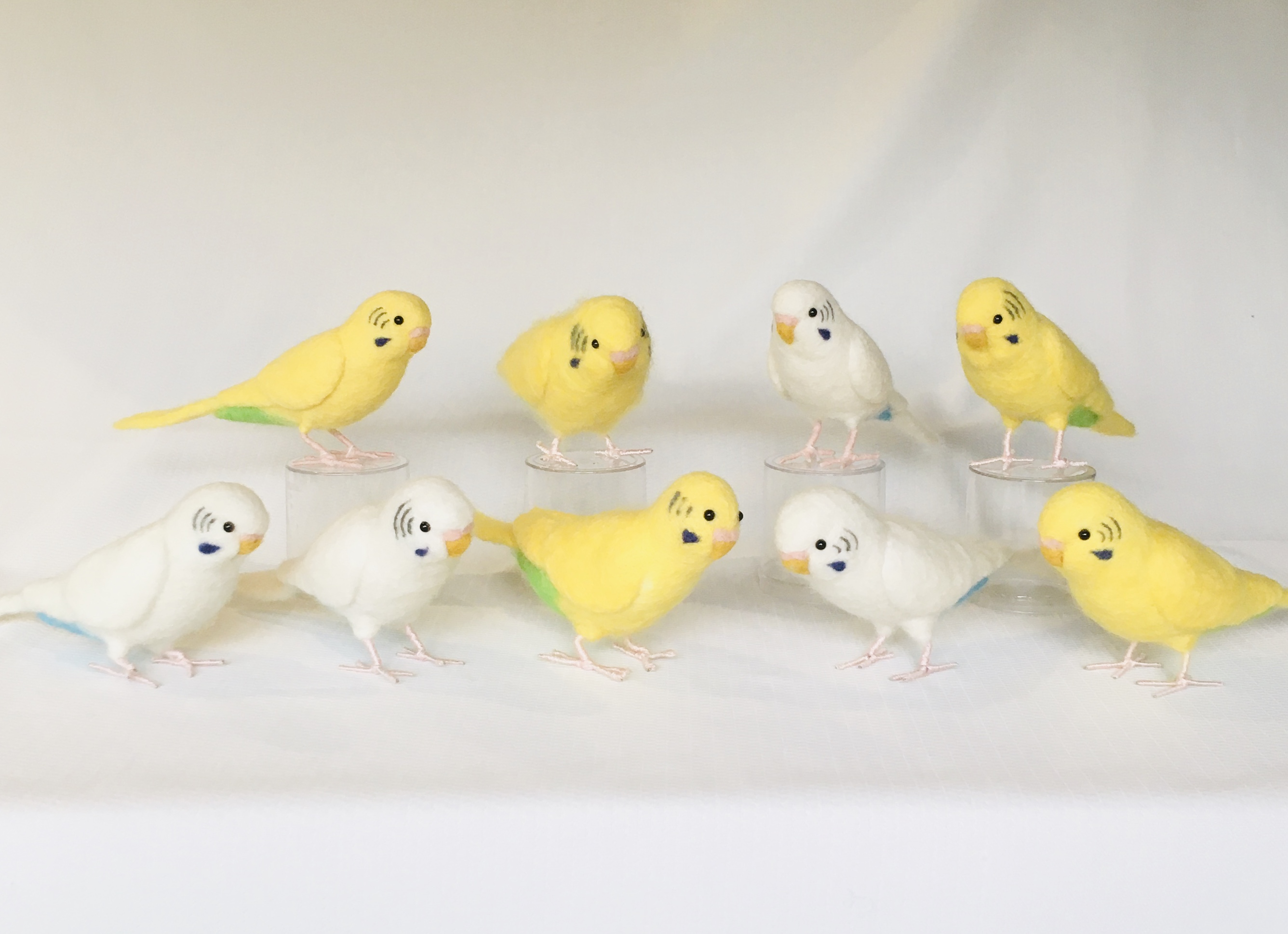 羊毛フェルトで作るプチリアル鳥講座「セキセイインコ(ハルクイン)」、金曜クラスと日曜クラスの両講座が今月完成しました♪